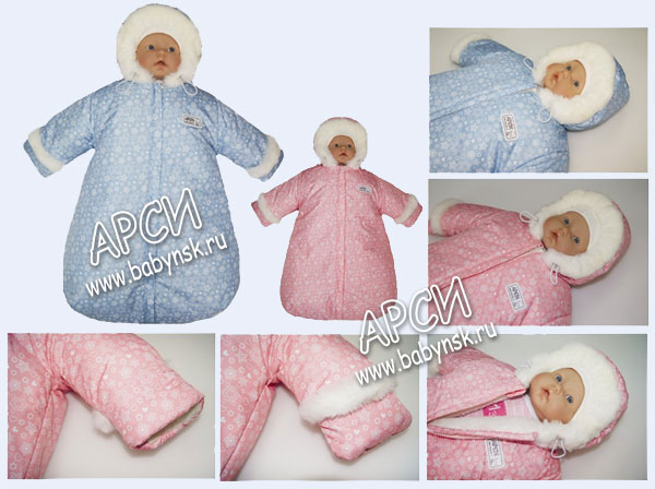 Теплый мешок для новорожденного малыша имеет удобный глубокий отворот рукава, который служит варежкой.