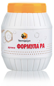 В составе: пыльца цветочная (обножка), экстракт пчелиной огневки (восковой моли), прополис, воск пчелиный.