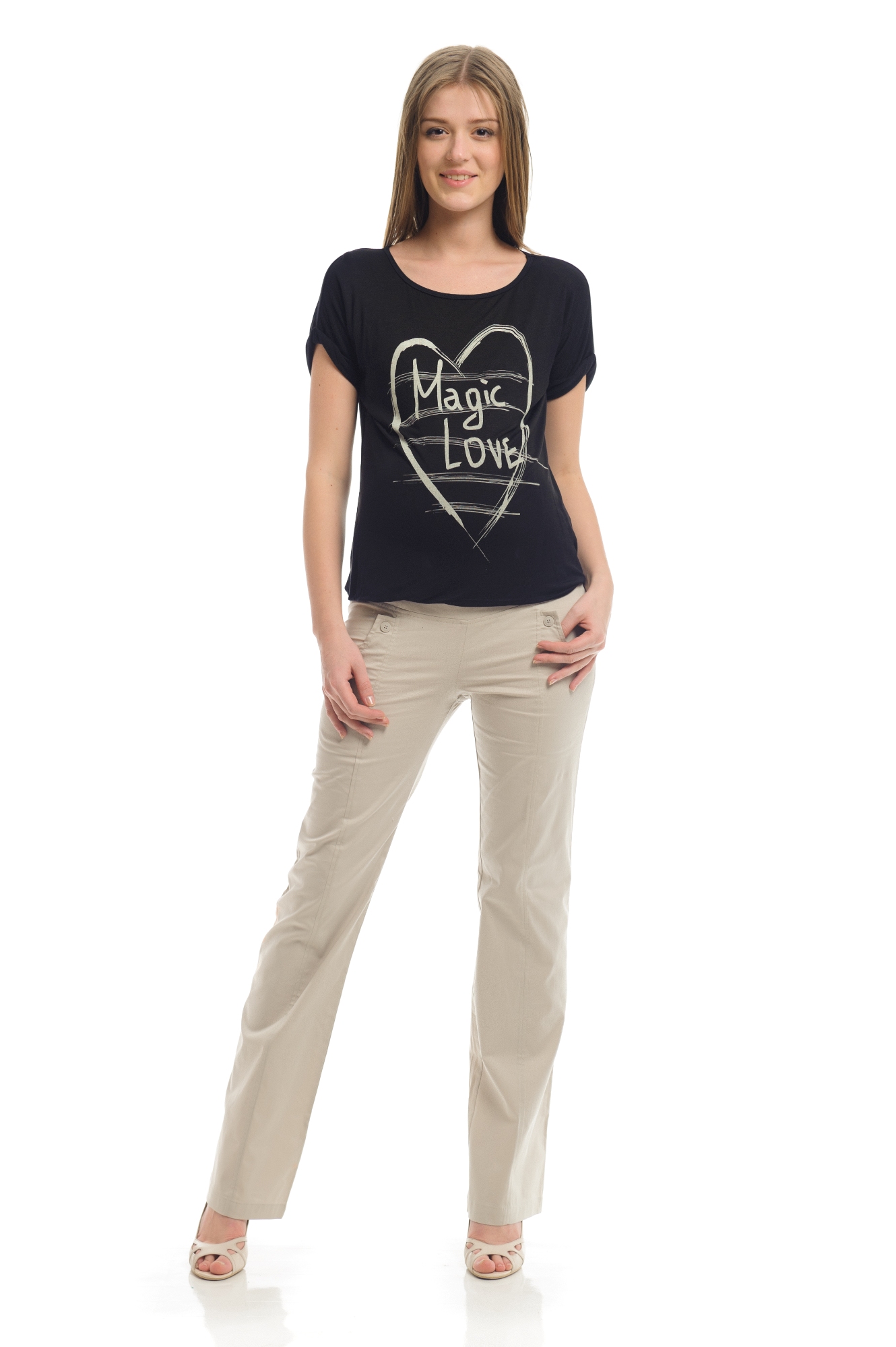 Прямые брюки из ткани с эластаном. По верху брюк вшита трикотажная кокетка по спинке, переходящая на перед. Трикотажная кокетка имеет регулировочную резинку, которая позволяет дополнительно регулировать давление на живот по мере его роста. Стройность фигуры подчеркивают вертикальные рельефы.